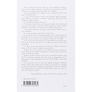 Pièce en deux actes pour cinq personnages écrite en français entre 1948 et 1949. Première publication aux Éditions de Minuit en 1952. « Vous me demandez mes idées sur En attendant Godot, dont vous me faites l'honneur de donner des extraits au Club d'essai, et en même temps mes idées sur le théâtre. Je n'ai pas d'idées sur le théâtre. Je n'y connais rien. Je n'y vais pas. C'est admissible. Ce qui l'est sans doute moins, c'est d'abord, dans ces conditions, d'écrire une pièce, et ensuite, l'ayant fait, de ne pas avoir d'idées sur elle non plus. C'est malheureusement mon cas. Il n'est pas donné à tous de pouvoir passer du monde qui s'ouvre sous la page à celui des profits et pertes, et retour, imperturbable, comme entre le turbin et le Café du Commerce. Je ne sais pas plus sur cette pièce que celui qui arrive à la lire avec attention. Je ne sais pas dans quel esprit je l'ai écrite. Je ne sais pas plus sur les personnages que ce qu'ils disent, ce qu'ils font et ce qui leur arrive. De leur aspect j'ai dû indiquer le peu que j'ai pu entrevoir. Les chapeaux melon par exemple. Je ne sais pas qui est Godot. Je ne sais même pas, surtout pas, s'il existe. Et je ne sais pas s'ils y croient ou non, les deux qui l'attendent. Les deux autres qui passent vers la fin de chacun des deux actes, ça doit être pour rompre la monotonie. Tout ce que j'ai pu savoir, je l'ai montré. Ce n'est pas beaucoup. Mais ça me suffit, et largement. Je dirai même que je me serais contenté de moins. Quant à vouloir trouver à tout cela un sens plus large et plus élevé, à emporter après le spectacle, avec le programme et les esquimaux, je suis incapable d'en voir l'intérêt. Mais ce doit être possible. Je n'y suis plus et je n'y serai plus jamais. Estragon, Vladimir, Pozzo, Lucky, leur temps et leur espace, je n'ai pu les connaître un peu que très loin du besoin de comprendre. Ils vous doivent des comptes peut-être. Qu'ils se débrouillent. Sans moi. Eux et moi nous sommes quittes. » (Samuel Beckett, Lettre à Michel Polac, janvier 1952)