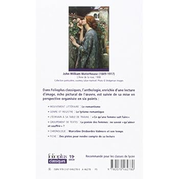 Dans Folioplus classiques, l'anthologie, enrichie d’une lecture d’image, écho pictural de l’œuvre, est suivie de sa mise en perspective organisée en six points : • MOUVEMENT LITTÉRAIRE : Le romantisme • GENRE ET REGISTRE : Le lyrisme romantique • L’ÉCRIVAIN À SA TABLE DE TRAVAIL : «Ce qu'une femme sait faire» • GROUPEMENT DE TEXTES : La poésie des femmes : ne savoir «qu'aimer et souffrir» ? • CHRONOLOGIE : Marceline Desbordes-Valmore et son temps • FICHE : Des pistes pour rendre compte de sa lecture Recommandé pour les classes de lycée.